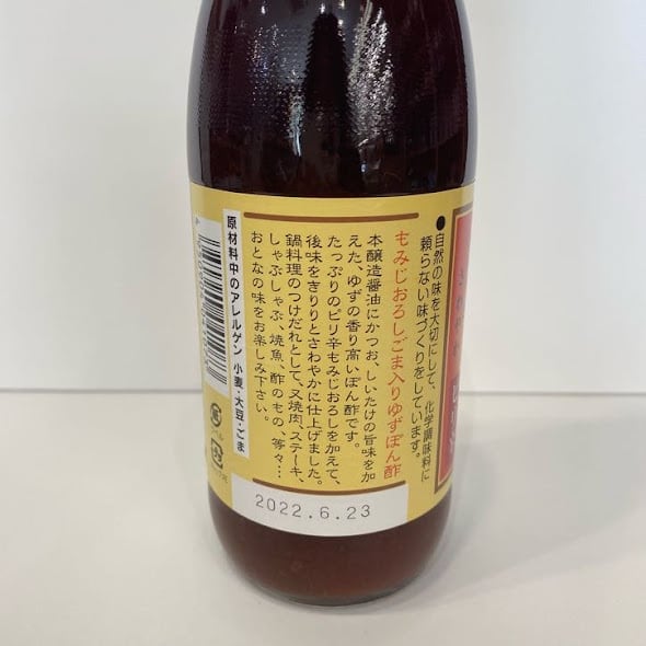 本醸造醤油(遺伝子組み換えで無い大豆使用)にかつお、しいたけの旨味を加え、ゆずの香り高いぽん酢です。たっぷりのピリ辛もみじおろしを加えて、後味をきりりとさわやかに仕上げました。化学調味料、保存料を一切使用していない自然の味を大切にした無添加の商品です。