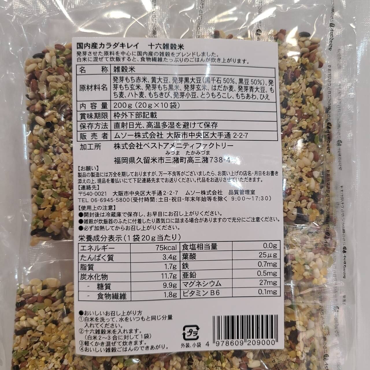 発芽もち赤米、黄大豆、発芽黒大豆(黒千石50%、黒豆50%)、発芽もち玄米、発芽もち黒米、発芽玄米、はだか麦、発芽青大豆、もち麦、ハト麦、もちきび、発芽小豆、とうもろこし、もちあわ、ひえ